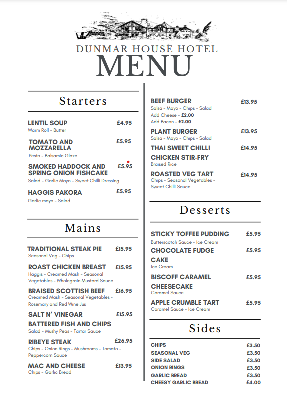 At Dunmar House, we celebrate the rich culinary traditions of Scotland while infusing our dishes with a modern twist. Our chefs are dedicated to creating meals that not only satisfy but also tell a story—one of heritage, flavor, and innovation. Whether you’re enjoying a classic dish or one of our unique creations, each bite is a journey through the finest Scottish produce.